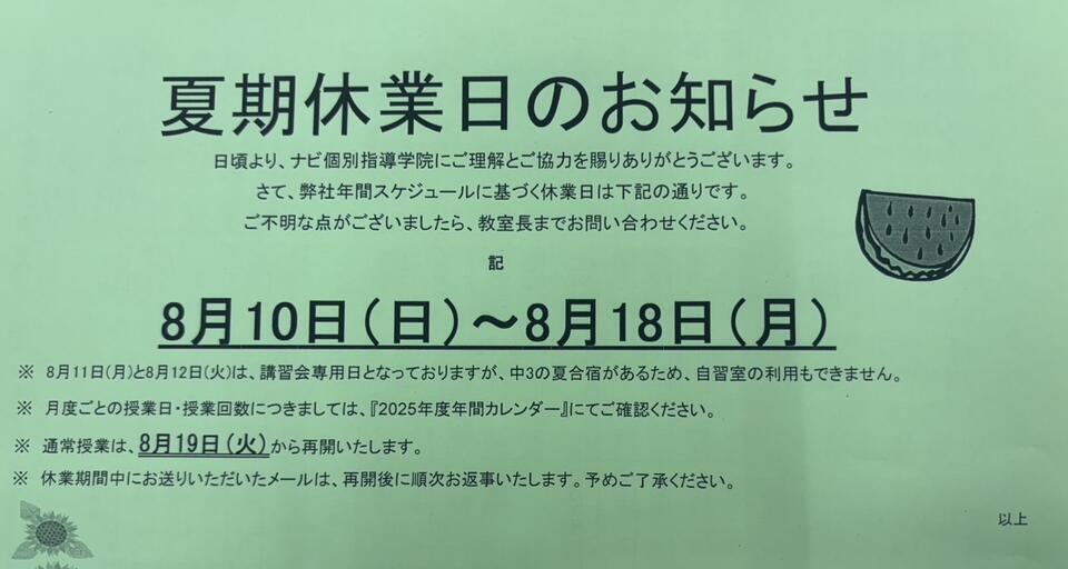 ※8月11日(月)と8月12日(火)は講習会専用日ですが、中3の夏合宿がありますので、自習室の利用もできません。