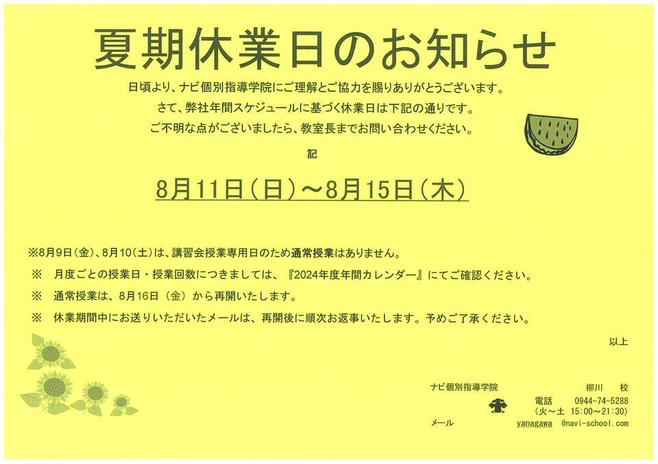 8/11(日)~8/15(木)までお盆休みとなってます。