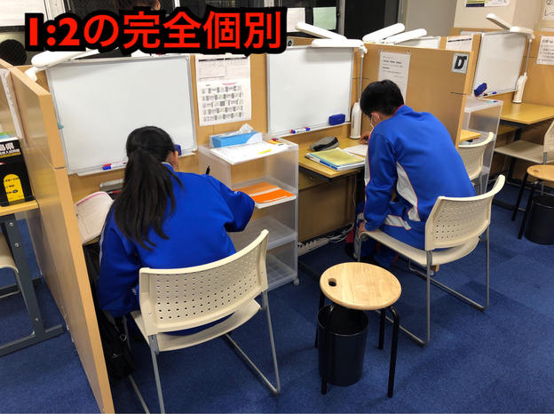 ナビ個別指導学院の授業は、個別の席ごとに設置された自分専用のホワイトボードで解き方や考え方を一緒に確認、それから生徒が問題を解くという「個別授業」スタイルです。