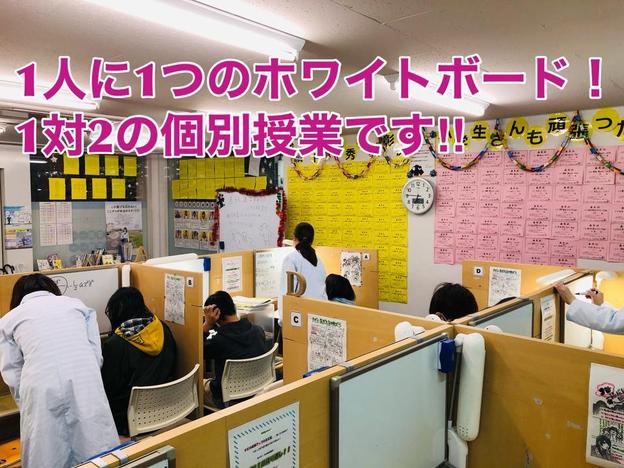 ナビ個別指導学院の授業は、個別の席ごとに設置された自分専用のホワイトボードで解き方や考え方を一緒に確認、それから生徒が問題を解くという「個別授業」スタイルです。