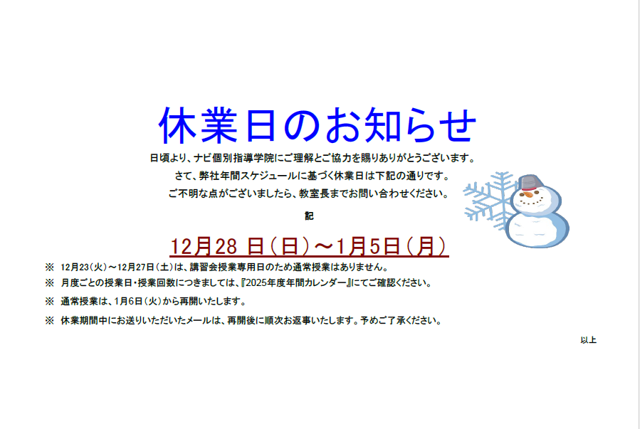 さて、弊社年間スケジュールに基づく休業日は下記の通りです。