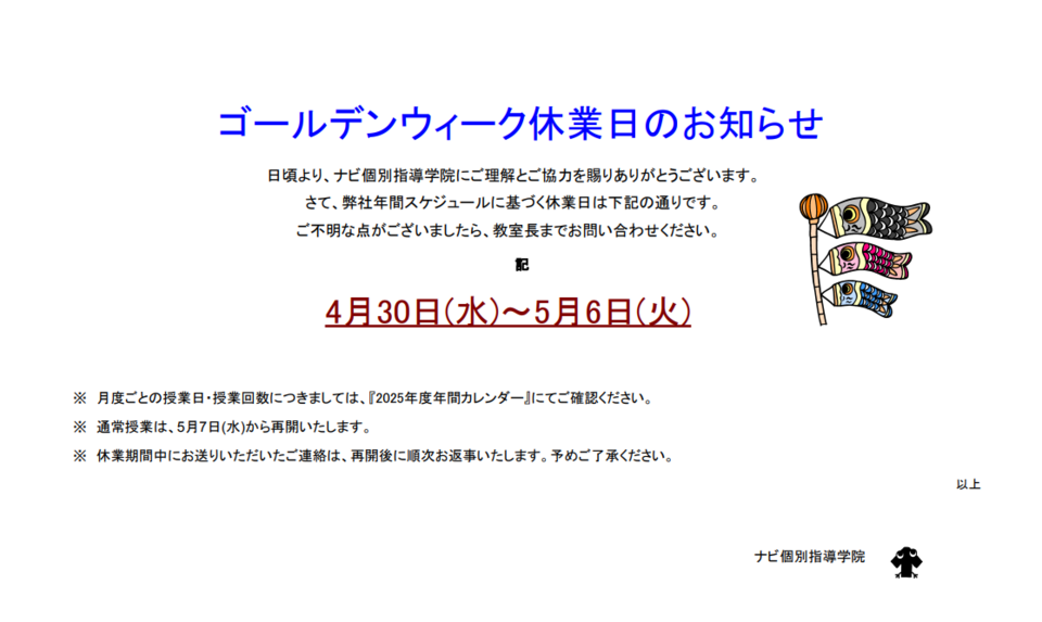 日頃より、ナビ個別指導学院にご理解とご協力を賜りありがとうございます。