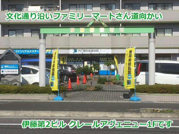 建物に向かって左手側に『ナビ個別指導学院』と看板のある