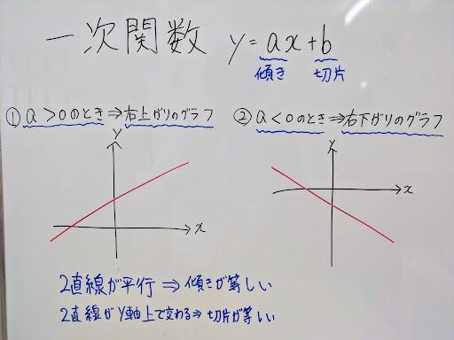①y=ax+bのグラフで傾きaがa>0の時は右上がりのグラフになる。