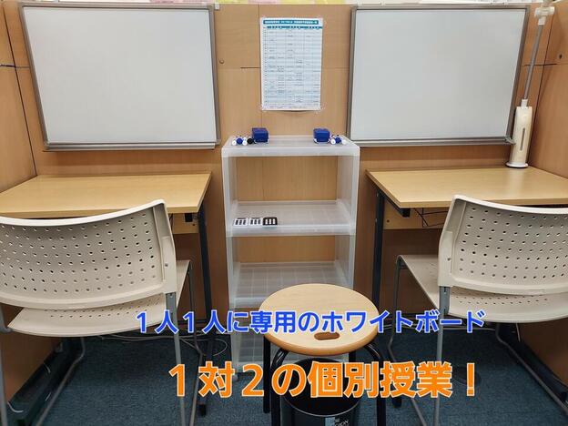 ナビ個別指導学院の授業は、個別の席ごとに設置された自分専用のホワイトボードで解き方や考え方を一緒に確認、それから生徒が問題を解くという「個別授業」スタイルです。