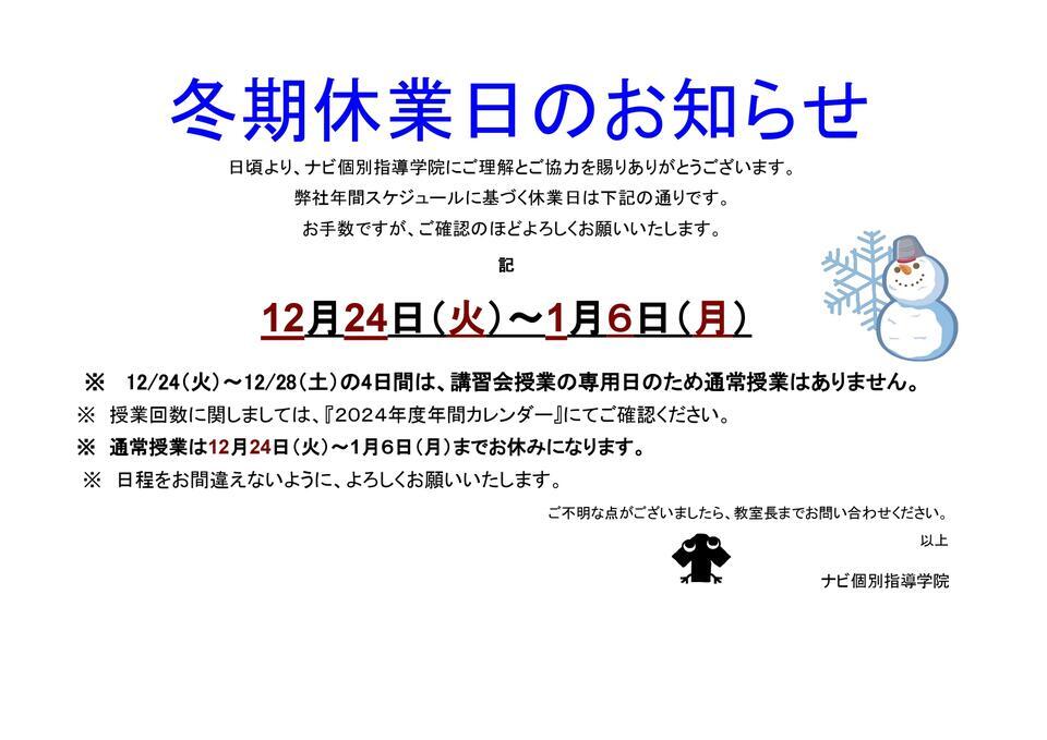 ※12/24(火)~12/28(土)に関しましては、講習会専用日のため通常授業はありません。