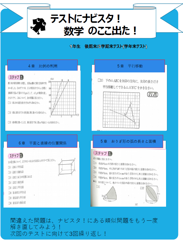 そこで、ナビ個別の自社教材「ナビスタ!」と近隣中学校の前年の定期テストの