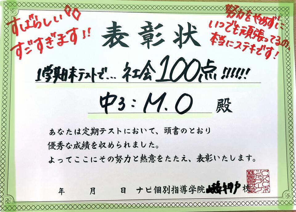 1学期末テストの社会でなんと100点満点という素晴らしい結果を残してくれました!!