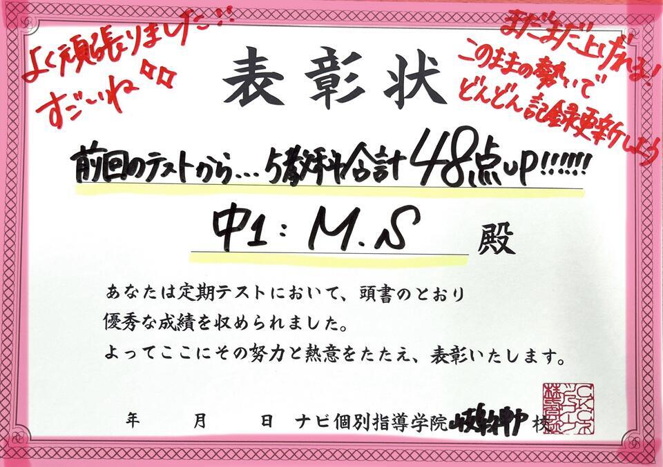 前期期末テストで、前回のテストから5教科合計48点アップという素晴らしい結果を残してくれました!!