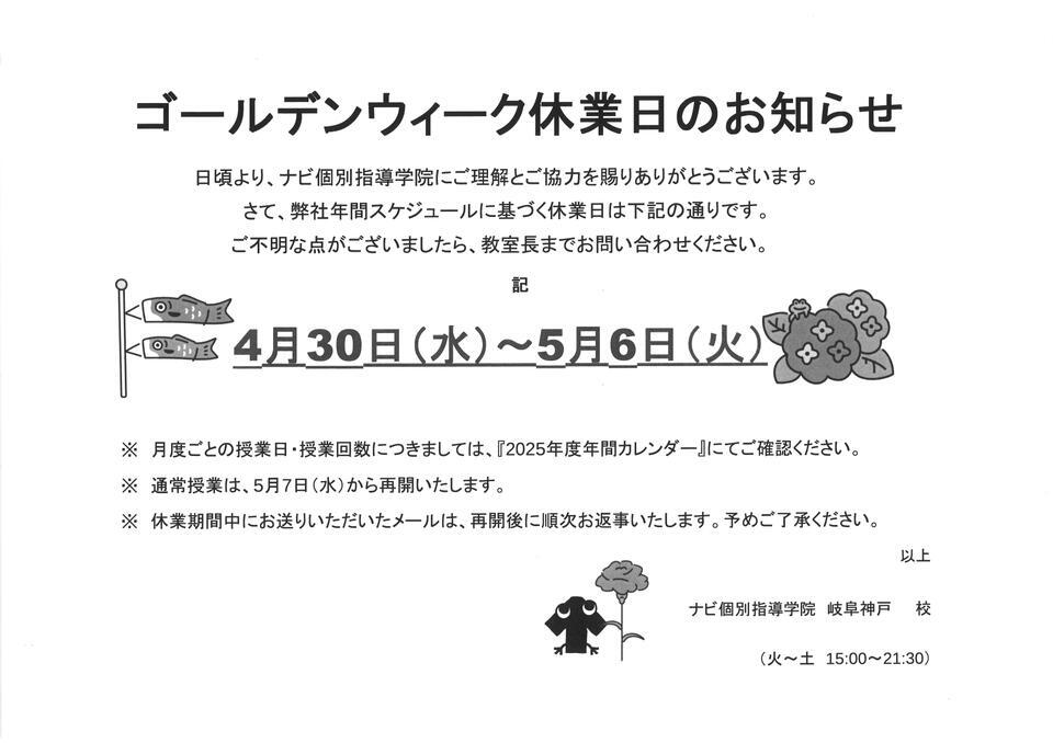 日頃より、ナビ個別指導学院にご理解とご協力を賜りありがとうございます。