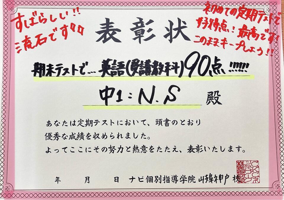 1学期期末テストで英語(受講教科)90点という素晴らしい結果を残してくれました!