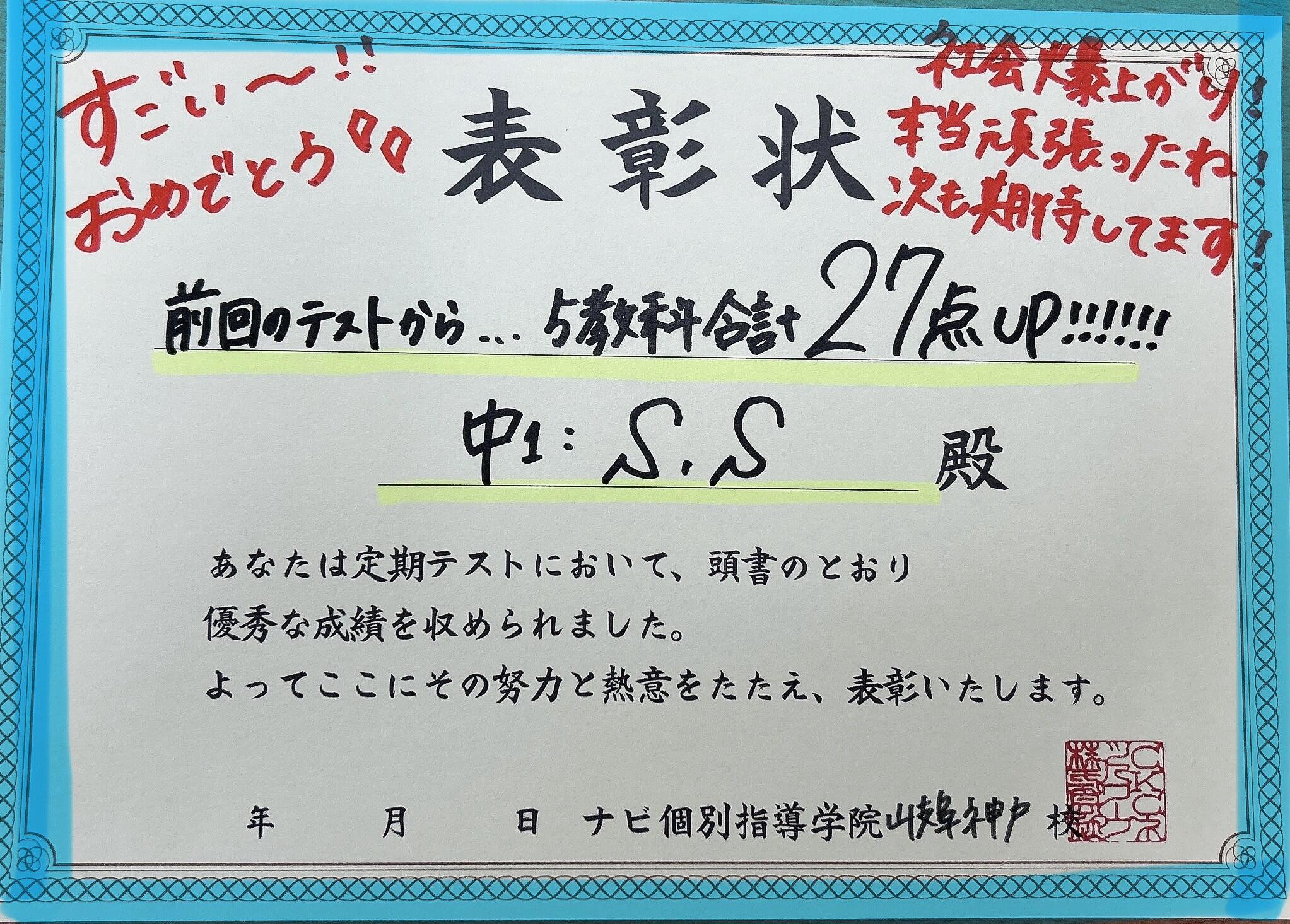 前回のテストから5教科合計27点アップという素晴らしい結果を残してくれました!
