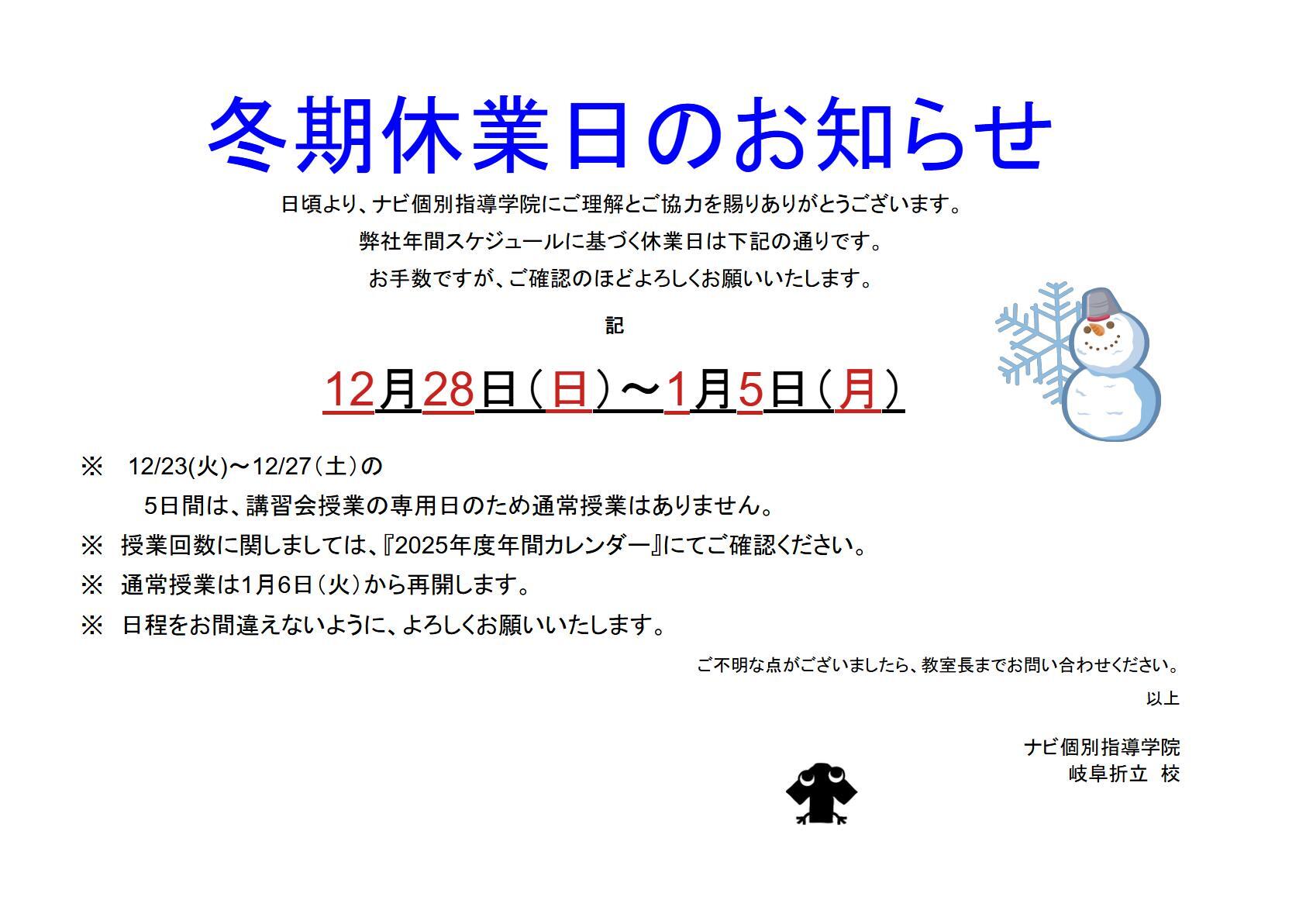 冬期休業日:12月28日(日)~ 1月5日(月)