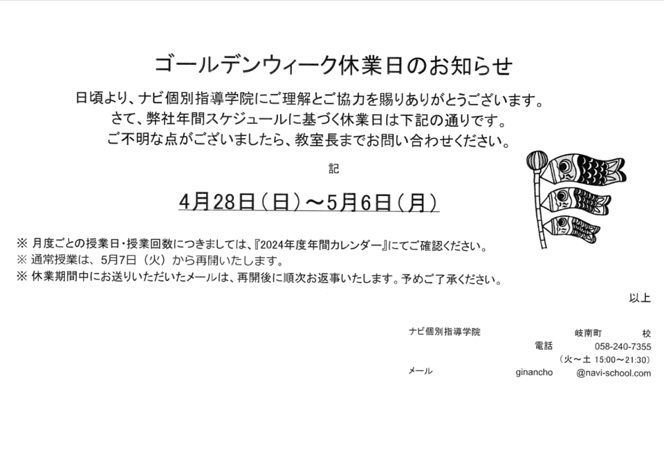 当塾では、4月28日(日)〜5月6日(月)まで、