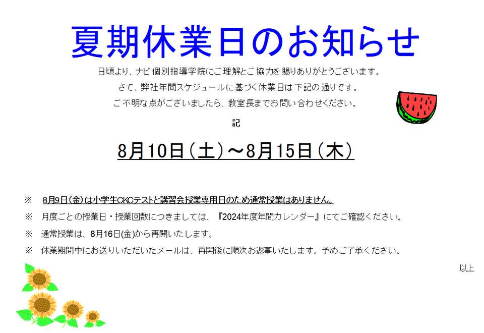 夏期休業日のお知らせ