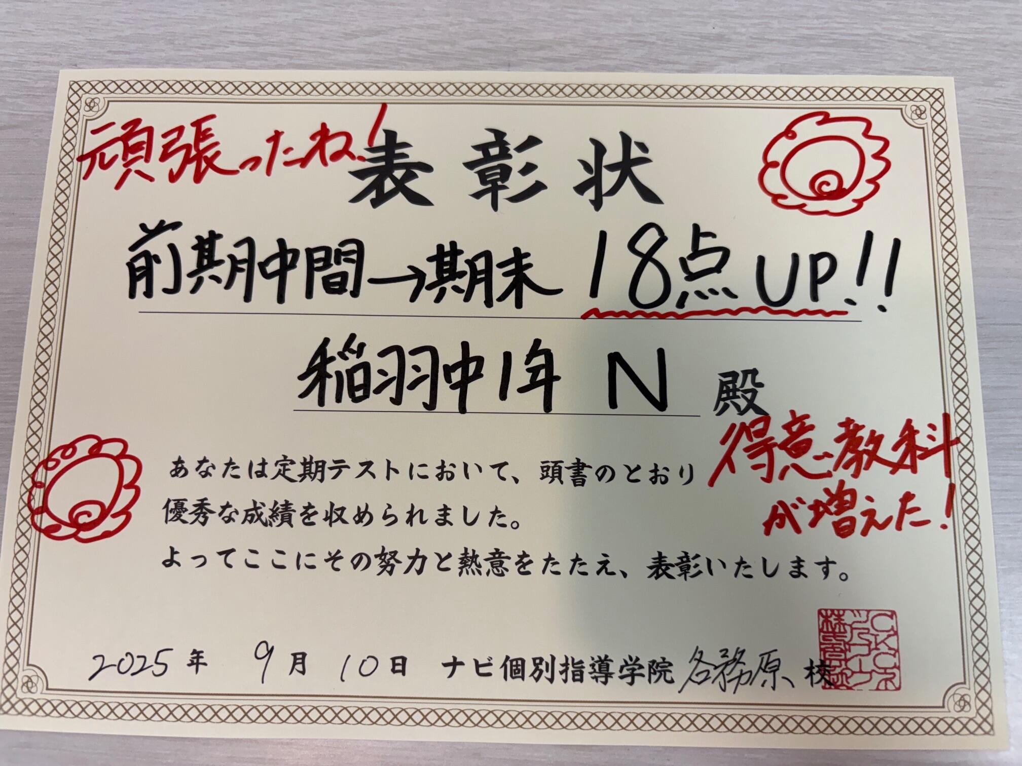 今週から早くも成績アップの報告をしてくれた生徒さんを紹介したいと思います。