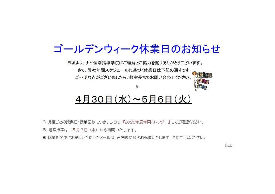 日頃より、ナビ個別指導学院にご理解とご協力を賜りありがとうございます。