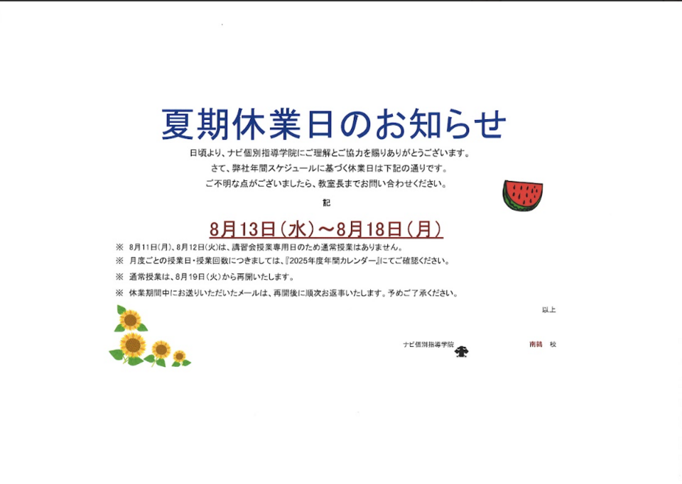 日頃より、ナビ個別指導学院にご理解とご協力を賜りありがとうございます。