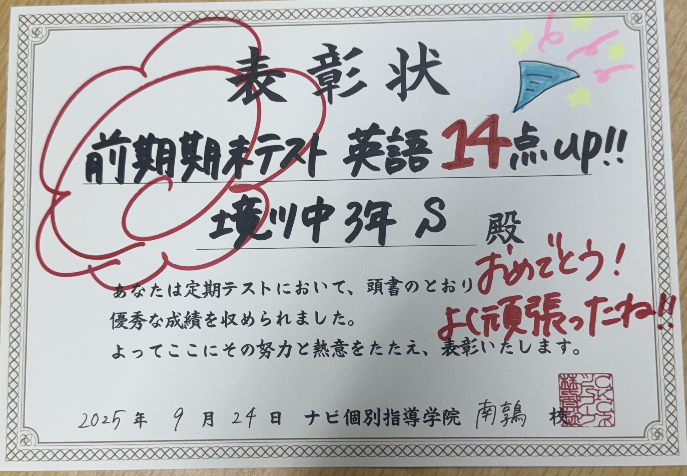 本日も前期期末テストで成績UPを果たしてくれた生徒さんを順番に紹介していこうと思います!