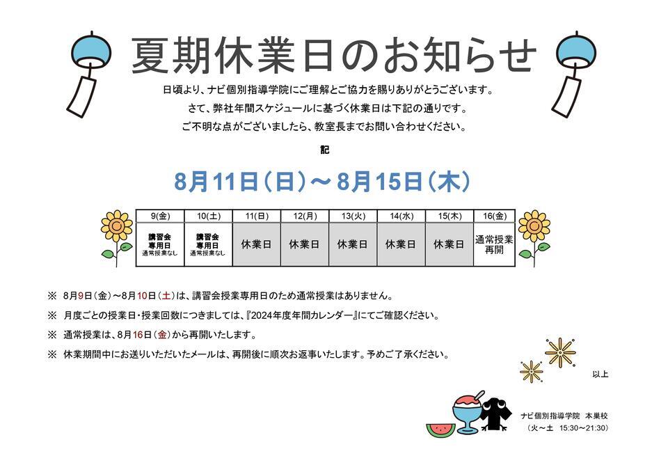 。 ★夏期休業日 8/11(日)~8/15(木) ★8/16(金)より通常授業を再開いたします。 。 ※月度ごとの授業日・授業回数につきましては、 『2024年度年間カレンダー』にてご確認ください。 。 ※休業期間中にお送りいただいた連絡は、 再開後に順次お返事いたします。 予めご了承ください。
