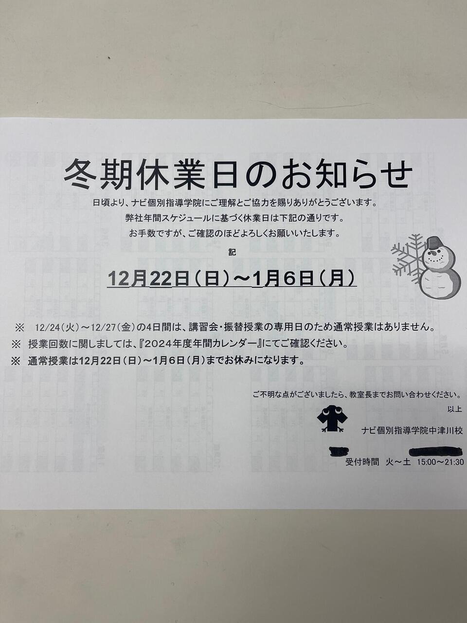 いつもナビ個別指導学院の運営に、ご理解ご支援いただきありがとうございます。当塾では、12月22日(日)~1月6日(月)まで、冬期休業をいただきます。通常授業は行っておりません。