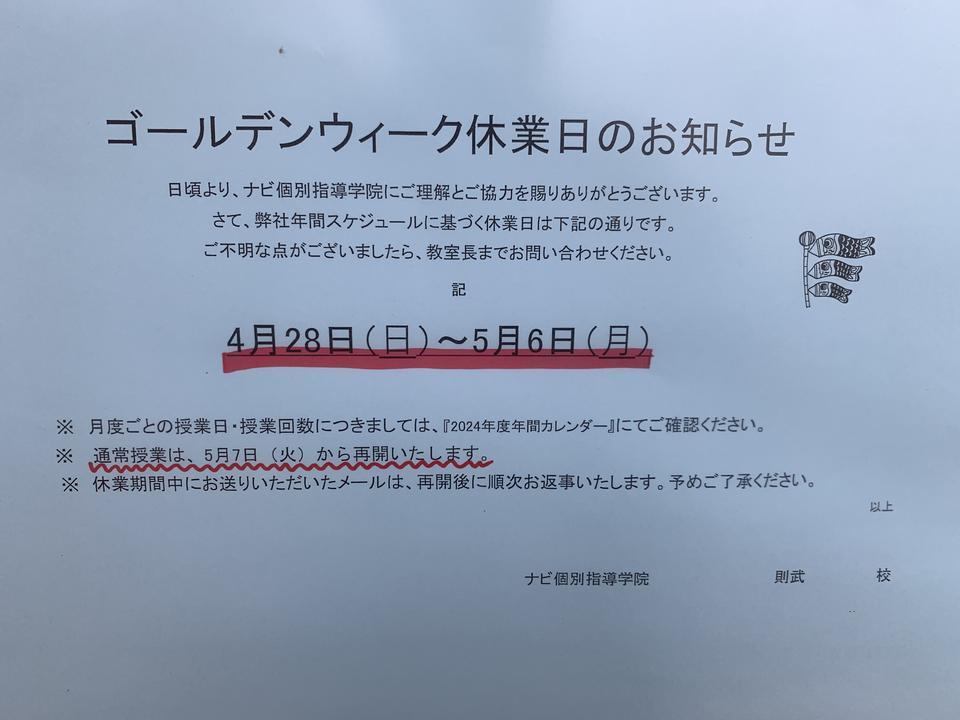 岐阜市、近隣地域の皆さん、こんにちは。ナビ個別指導学院 則武校です。 さて、弊社年間スケジュールに基づく休業日は下記の通りです。休業日:4/28(日)~5/6(月)授業は、5/7(火)より再開をいたします。※無料体験の実施も同様になります。 お休み期間中に頂きましたご連絡は、5/7以降にご対応させて頂きますので、宜しくお願い致します。