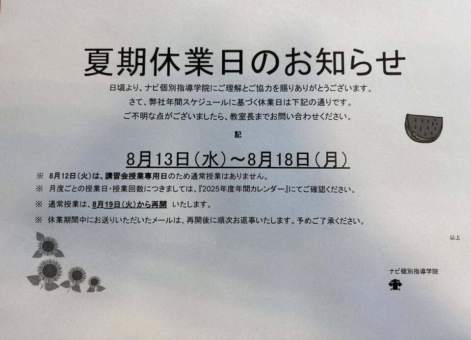日頃より、ナビ個別指導学院にご理解とご協力を賜りありがとうございます。