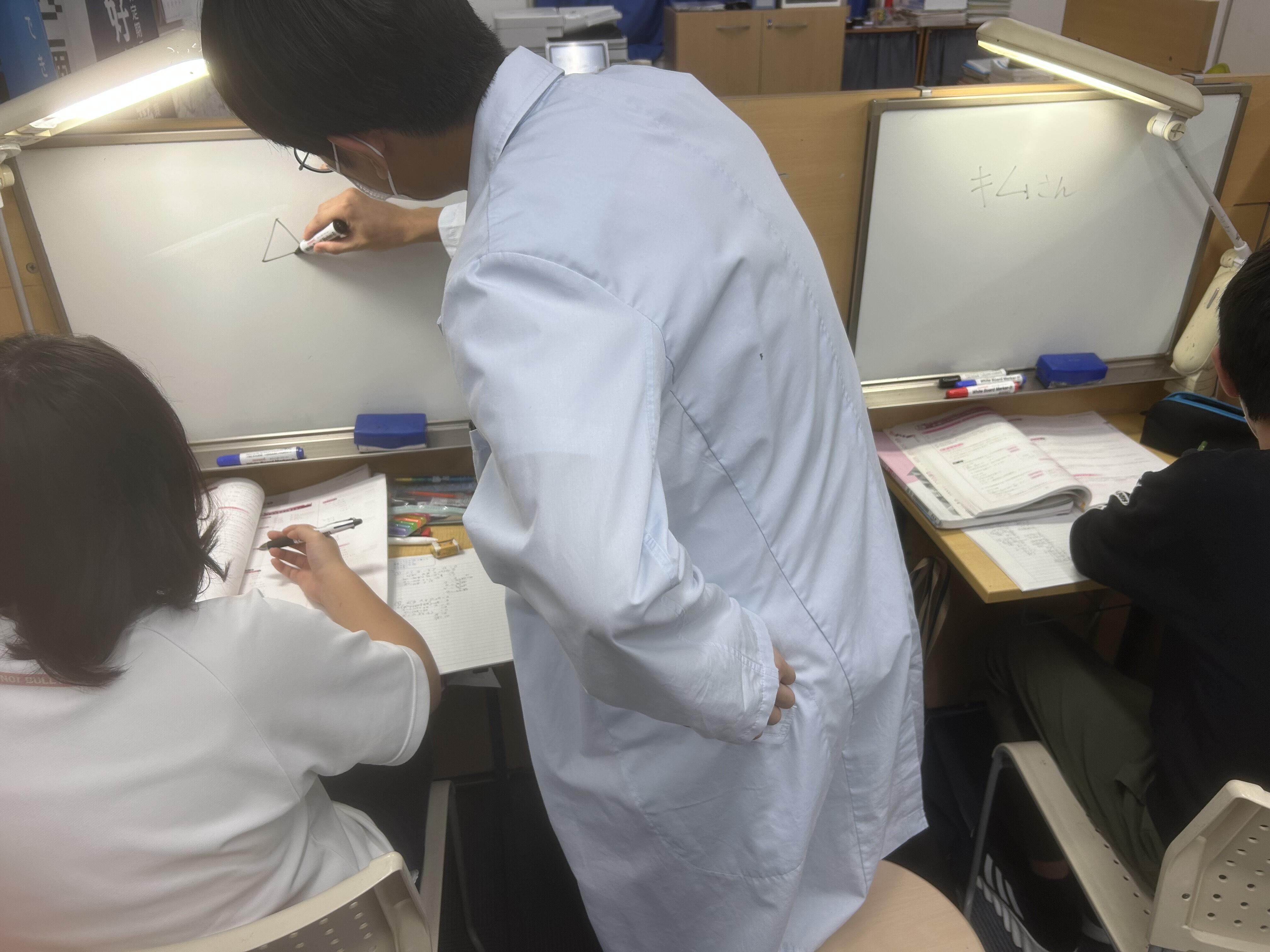 ナビ個別指導学院の授業は、個別の席ごとに設置された自分専用のホワイトボードで解き方や考え方を一緒に確認、それから生徒が問題を解くという「個別授業」スタイルです。