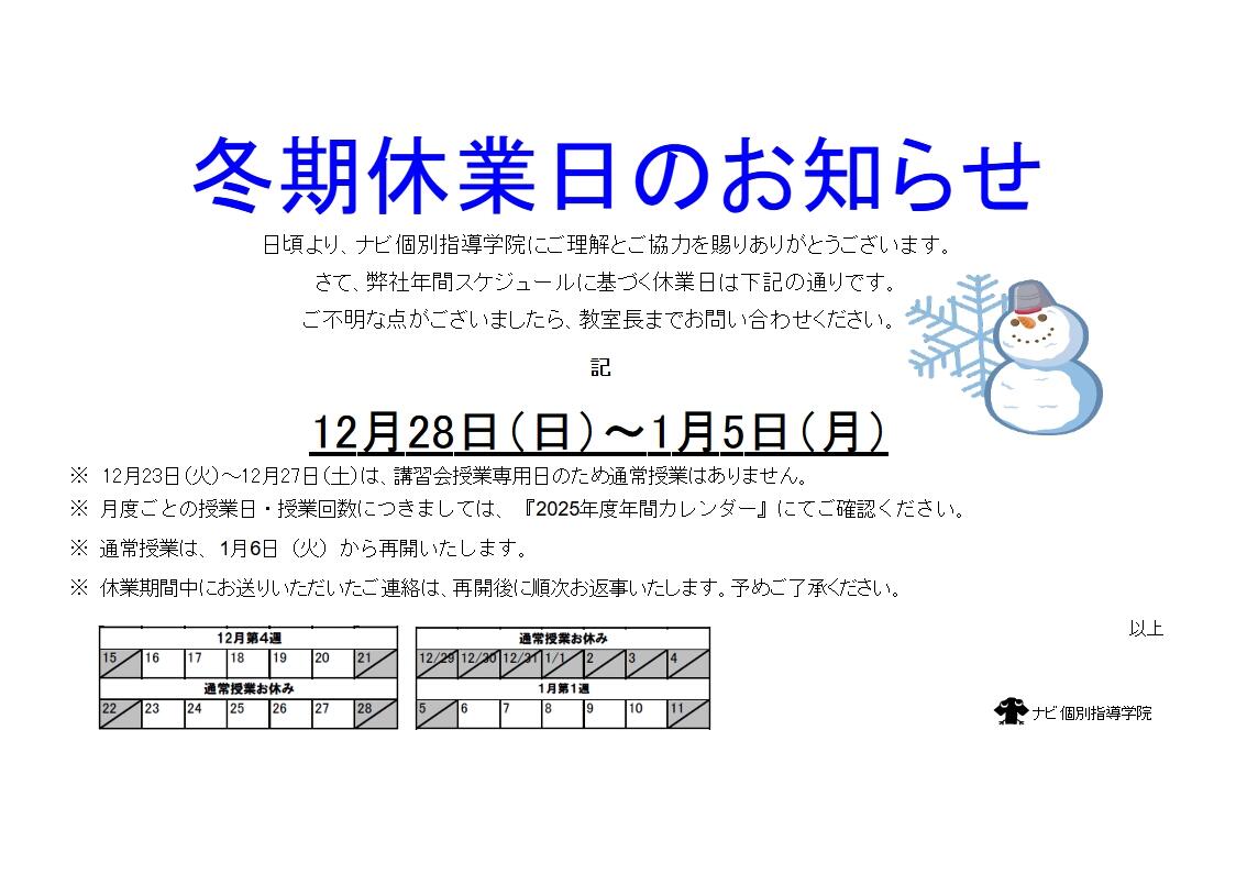 上記の期間中は授業の提供や自習室の開放、お問合せの対応等は