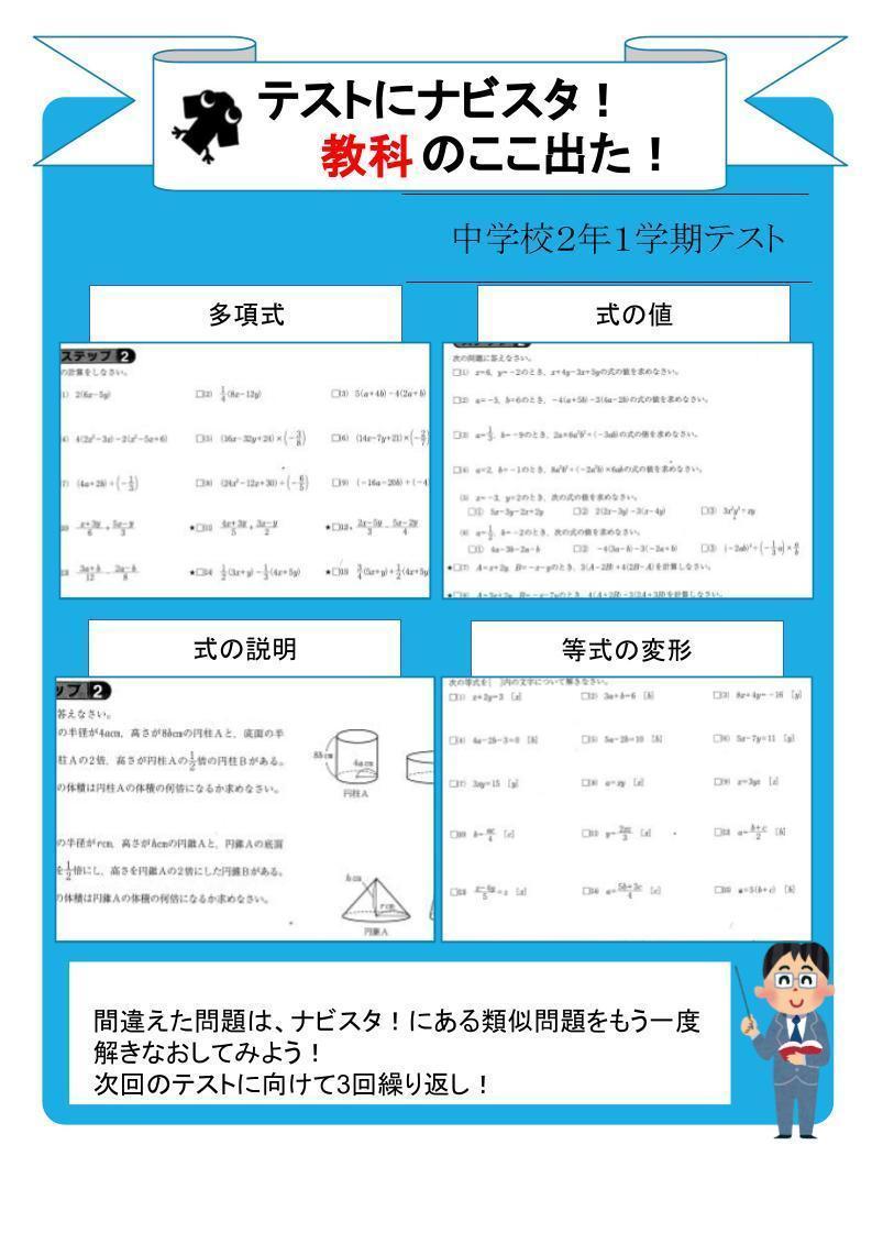 そこで、ナビ個別の自社教材「ナビスタ!」と近隣中学校の前回定期テストの分析を「ここ出た!」で確認してみましょう!