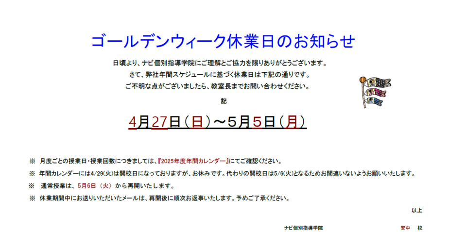4月27日(日)~5月5日(月)はGW休業日となります。