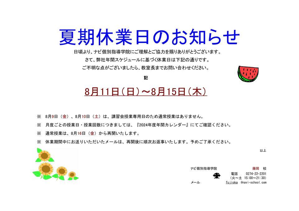 ※8月9日(金)、8月10日(土)は、講習会専用日のため、通常授業はありません。