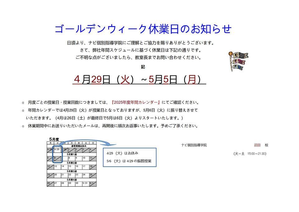 4月27日(日)~5月5日(月)はGW休業日となります。