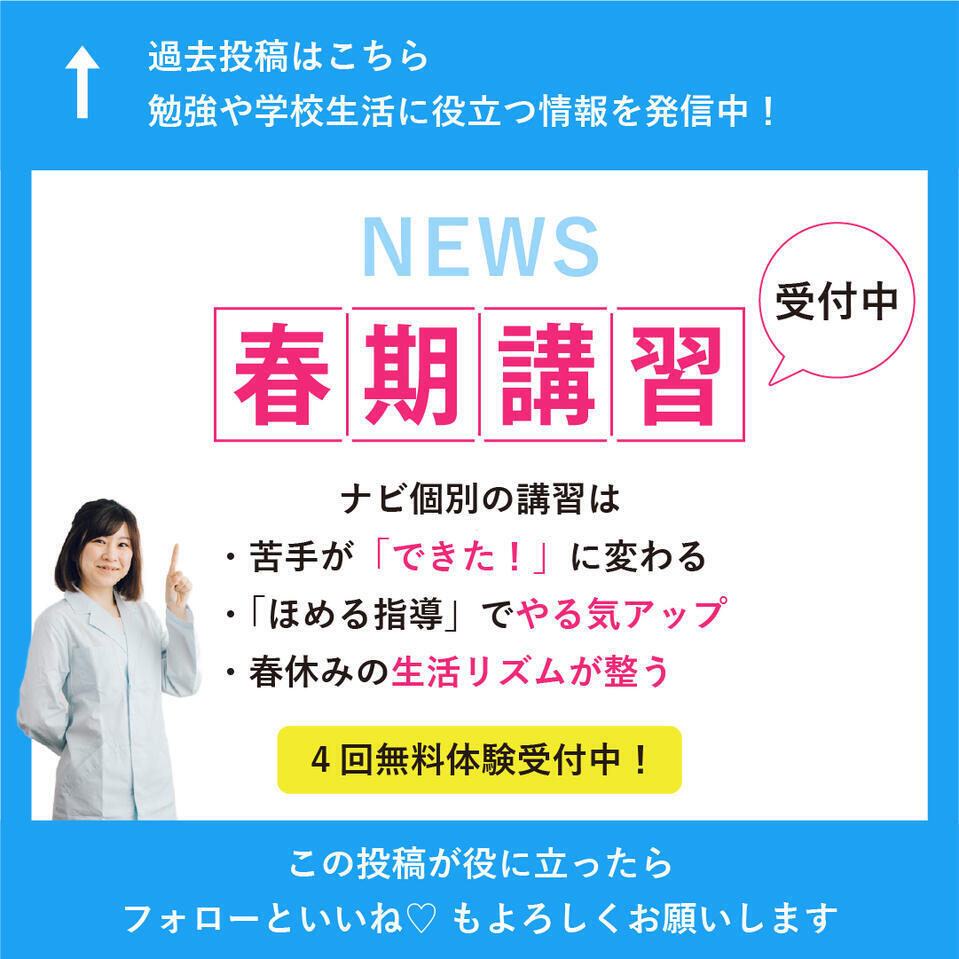 4月から始まる新学年に備えて、ナビでは先取り学習も行います。特に進学や進級に向けて、予習を行うことで自信を持って新しい学習内容に取り組めるようになります。例えば、次の学年で扱う主要科目について、予習を行うことで、授業が始まった時に「予習済み」となり、理解が深まります。難易度の高い教科では、先取り学習がとても有効的です。新学年に入る前に、少し先の内容を学び、授業での理解度を高めてまいりましょう。