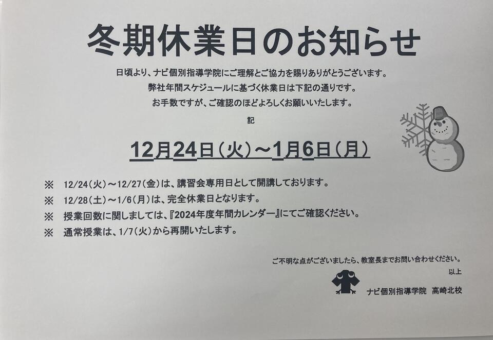 1月7日(火)より通常授業を再開いたします。 今後ともよろしくお願いいたします。
