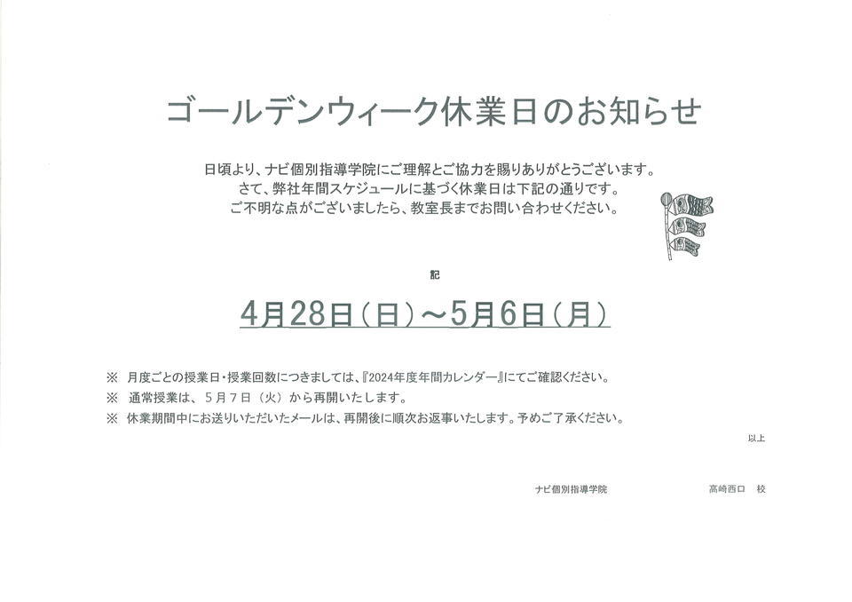 4月28日(日)~5月6日(月)まではお休みとなります。