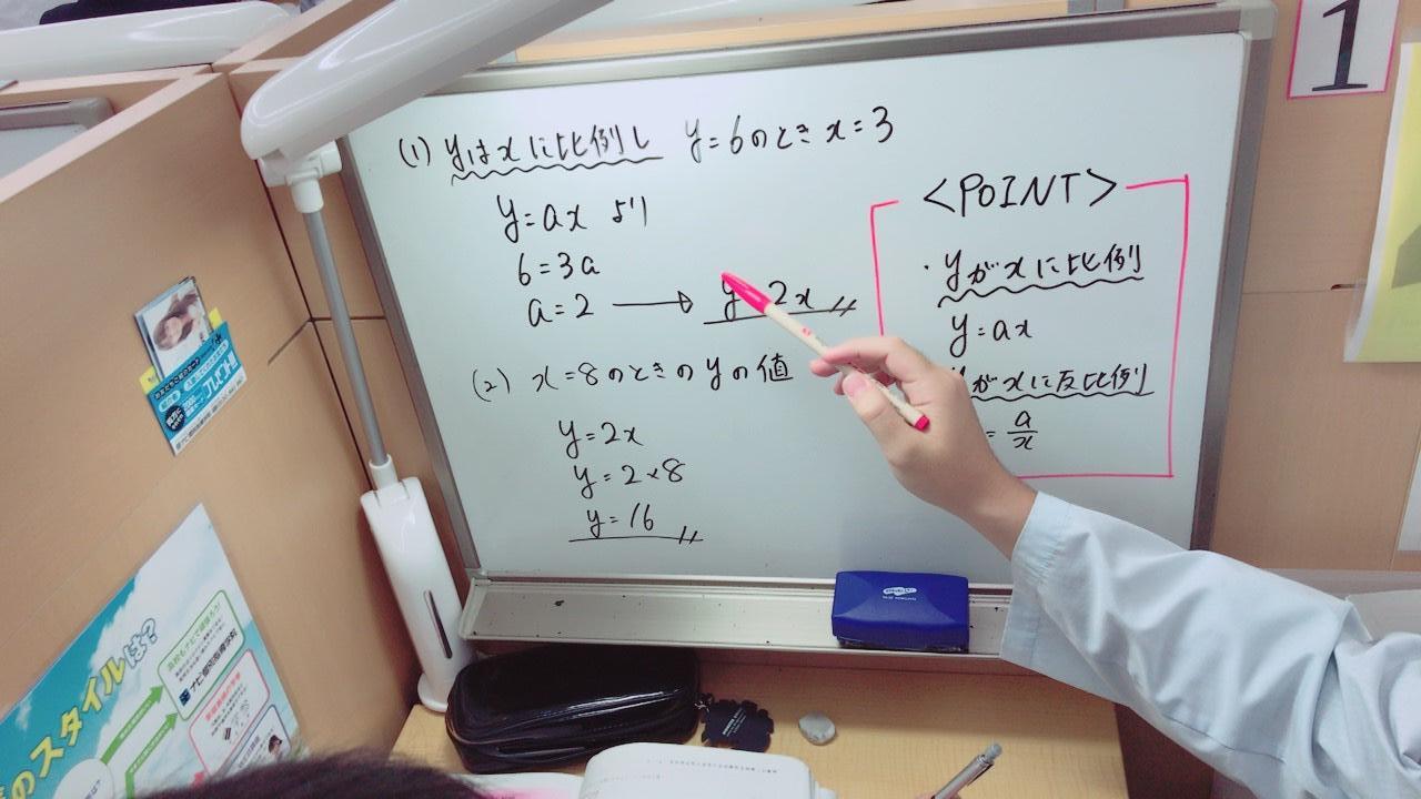 ナビ個別指導学院の授業は、個別の席ごとに設置された自分専用のホワイトボードで解き方や考え方を一緒に確認、それから生徒が問題を解くという「個別授業」スタイルです。