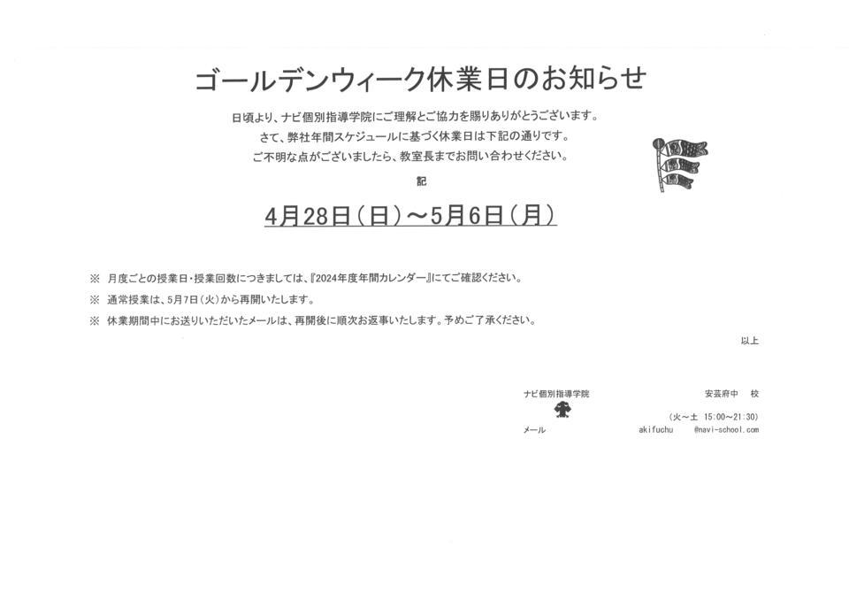 ゴールデンウィーク休業日のお知らせ日頃より、ナビ個別指導学院にご理解とご協力を賜りありがとうございます。さて、弊社年間スケジュールに基づく休業日は下記の通りです。GW休業日 4月28日(日)~5月6日(月)5月7日(火)より通常授業を再開いたします。※月度ごとの授業日・授業回数につきましては、『2024年度年間カレンダー』にてご確認ください。※休業期間中にお送りいただいたメールは、再開後に順次お返事いたします。予めご了承ください。