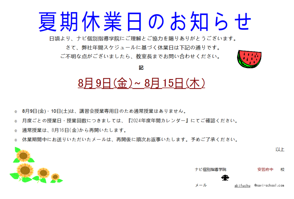 8月9日(金)~8月15日(木)は夏期休業日です。