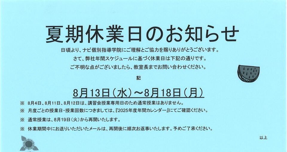 日頃より、ナビ個別指導学院にご理解とご協力を賜りありがとうございます。