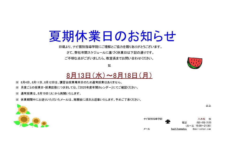 ※8/11(月)8/12(火)に関しましては、講習会専用日の為、通常授業はお休みです。