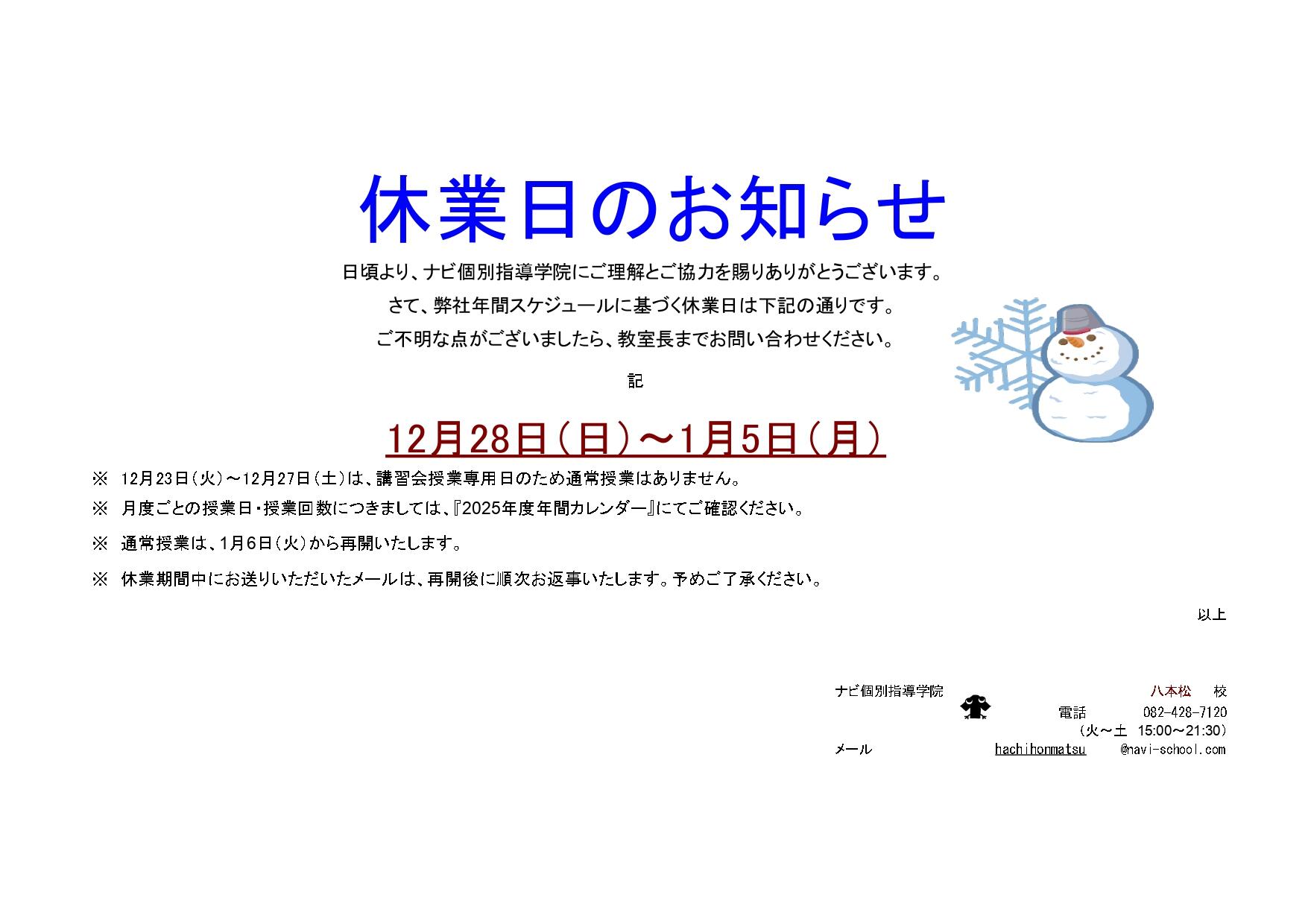 ※12月23日(火)から12月27日(土)に関しましては、講習会専用日の為、通常授業はお休みです。
