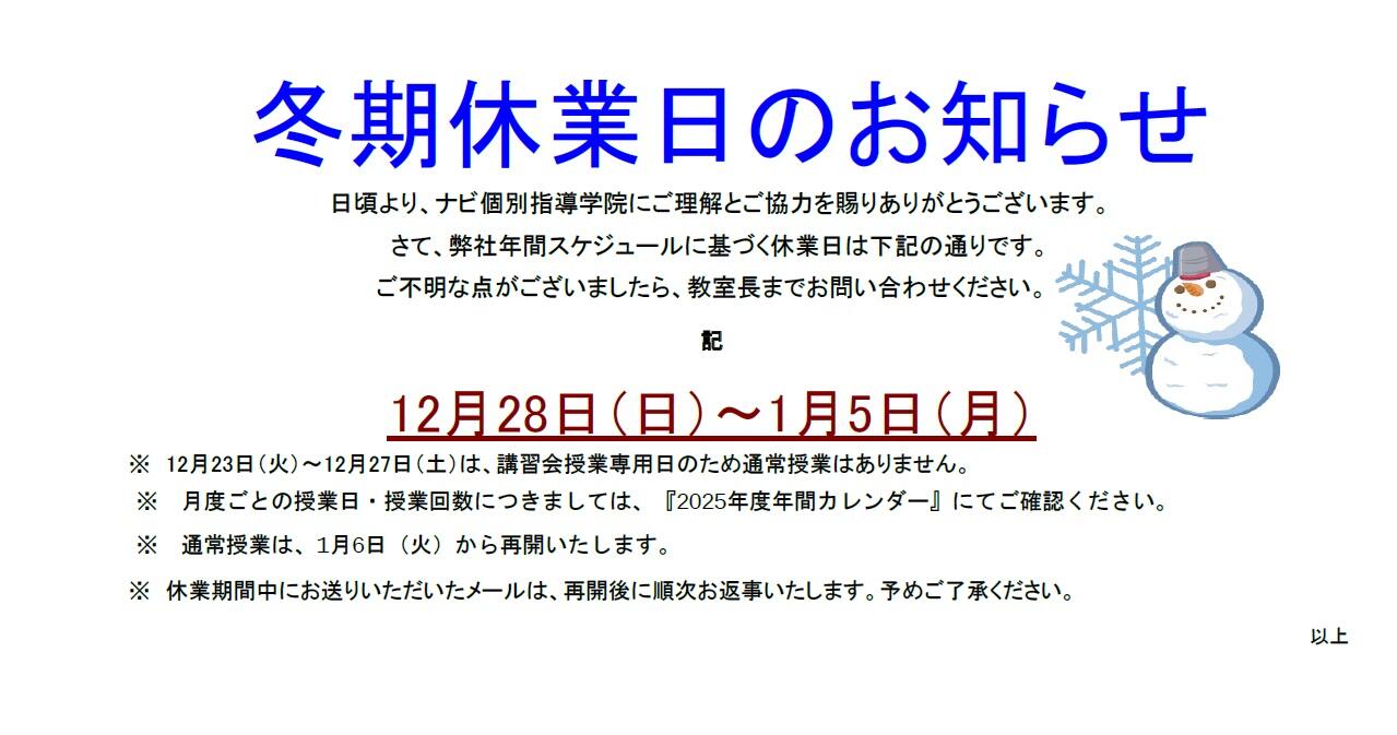 冬期休業日 12月28日(日)~1月5日(月)自習室も含め休業となります!