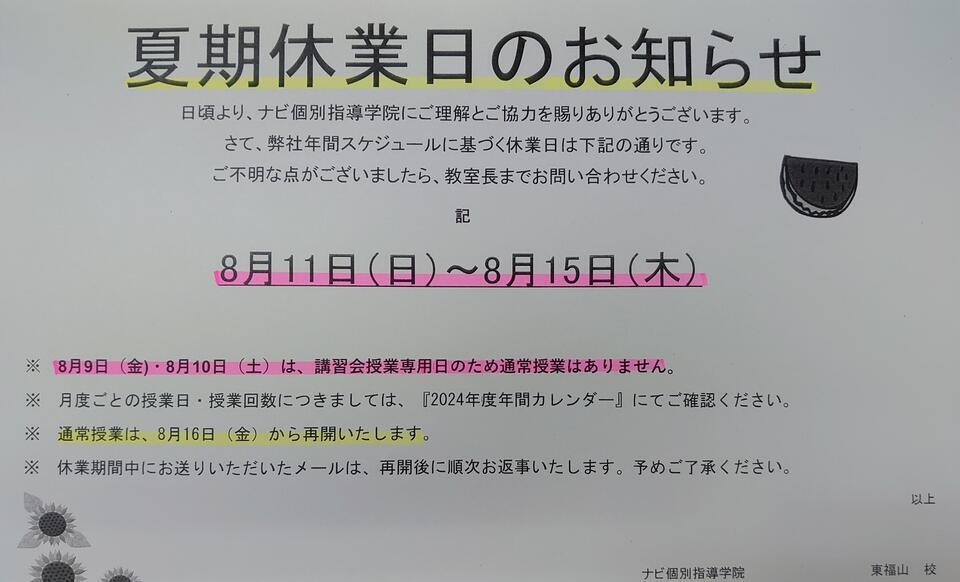 また、8月9日(金)・8月10日(土)は、講習会専用日のため通常授業はありません。
