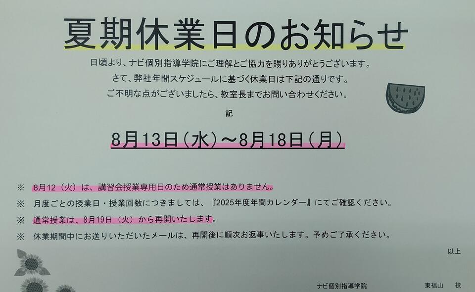 また、8月12日(火)は、講習会専用日のため通常授業はありません。