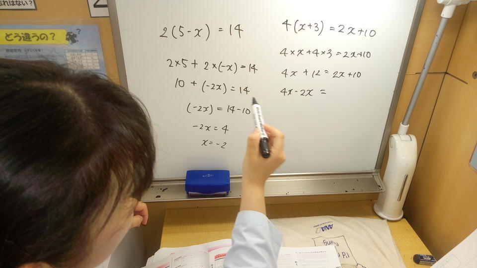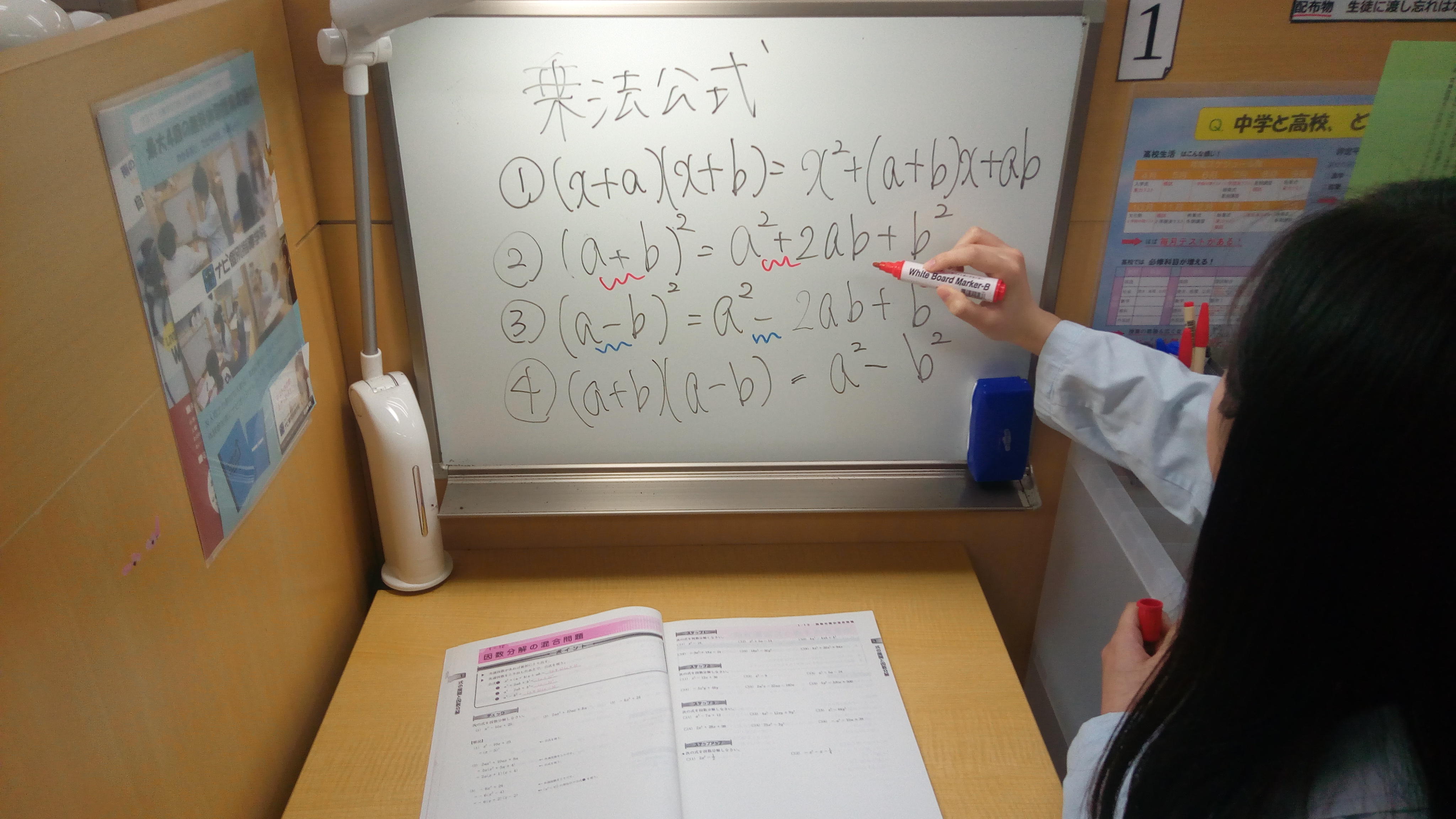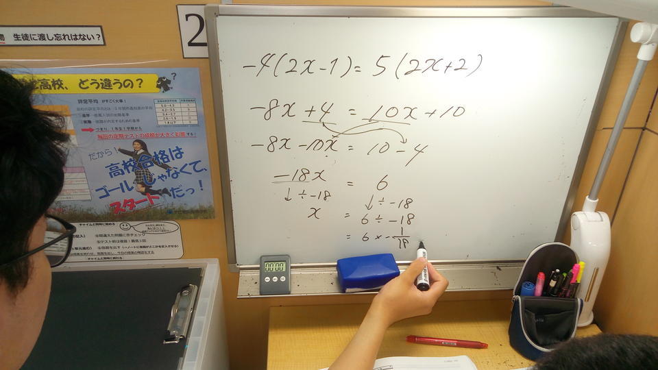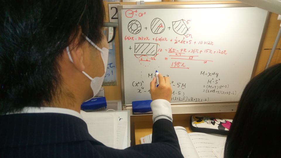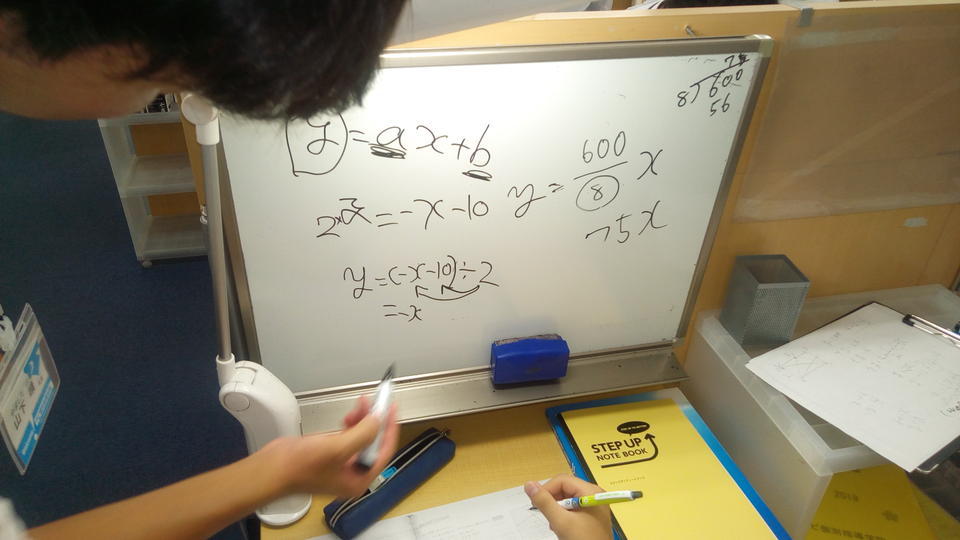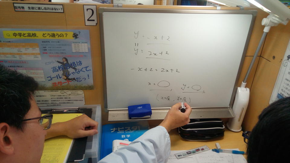 ナビ個別指導学院の授業は、個別の席ごとに設置された自分専用のホワイトボードで解き方や考え方を一緒に確認、それから生徒が問題を解くという「個別授業」スタイルです。