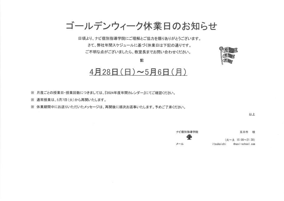 GW休業日 4月28日(日)~5月6日(月)