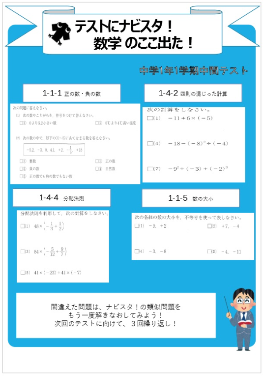 1年生の最初のテストでは、新しく習う正負の数の計算問題が多く出題されていました。