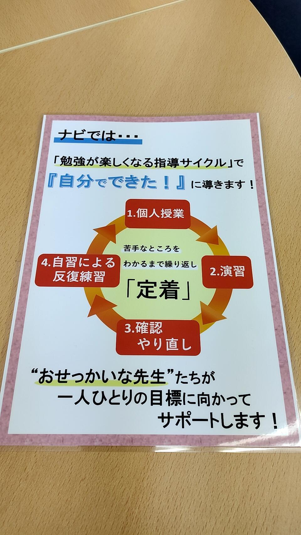ナビでは特に中学生の方の予習授業ではテストまでに3回反復をします。これで多くの方が成績アップ!!をしていただいています。
