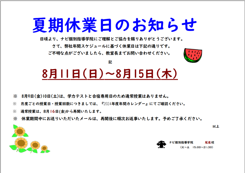 お盆明けに元気な皆さんに会えるのを楽しみにしています☺